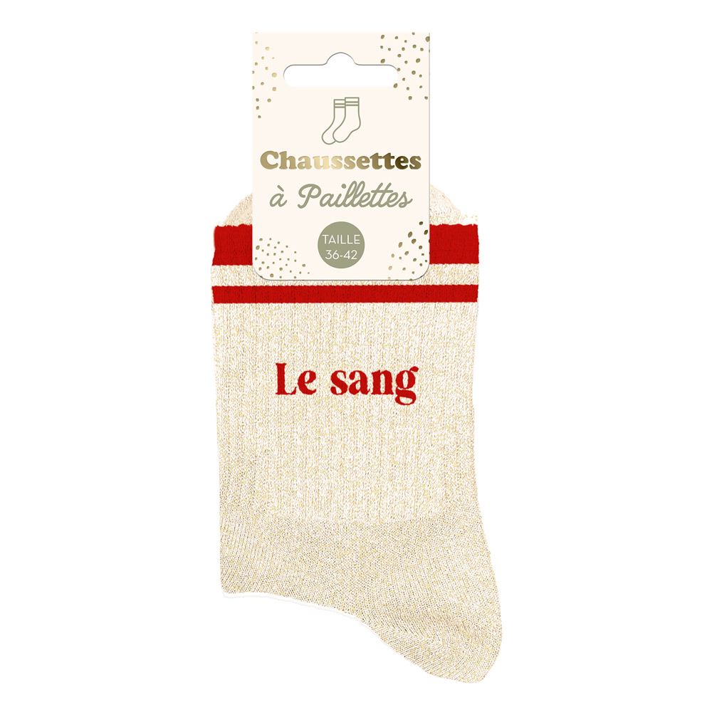 Envie de faire couler l’encre avec style ? Les Chaussettes à Paillettes A Bandes Le Sang sont là pour faire passer un message fort et humoristique : « Le Sang » qui coule dans vos veines est unique, alors montrez-le ! Avec leurs bandes scintillantes et leur design percutant, ces chaussettes ajoutent une touche de rébellion et de fun à votre journée.