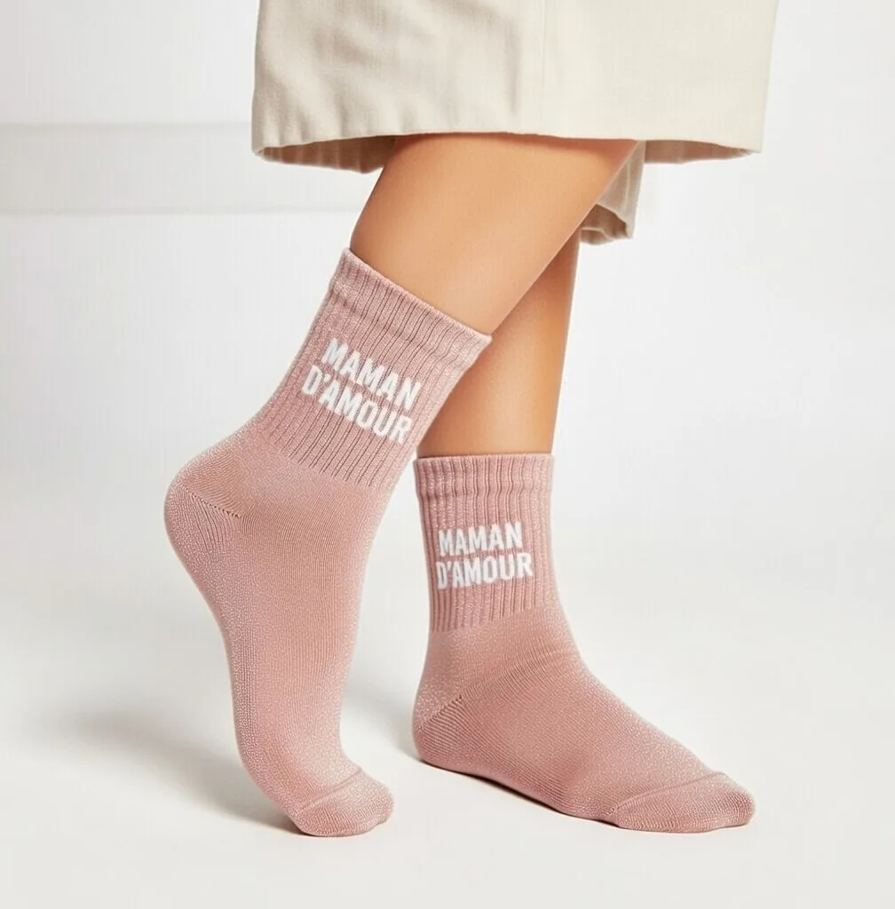On ignore souvent le pouvoir d’un accessoire simple. Cette chaussette paillette maman d amour combine une base rose franche avec un lettrage affectif qui claque. C’est l’accessoire signature par excellence pour celles qui aiment le détail.