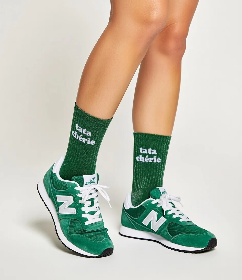 Ce vert vibrant n’est pas anodin, c’est l’âme de cette chaussette a paillette tata. Avec 11 % de fibres métallisées, elles réveillent un look trop sage. C’est le détail qui change tout.