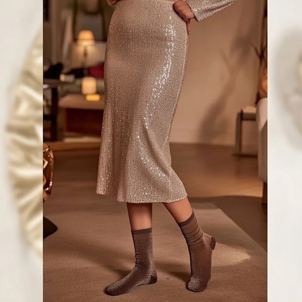 Les chaussettes à paillettes deviennent un prolongement naturel de la tenue festive.